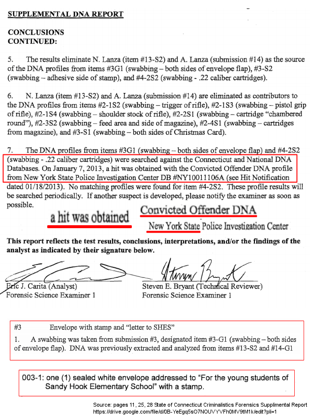 Furthermore this report also reveals a sealed white envelope found on Adam Lanza that was addressed “For the young students of Sandy Hook Elementary School” had a convicted felons DNA on the adhesive part you lick and the back of the stamp.